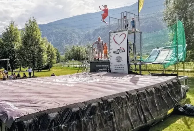 Trampoline parc mobile avec airbag. Effectuez vos sauts freestyle et figures en toute sécurité. Trois hauteurs de sauts pour convenir à tous les niveaux et tous les âges. Avec une cadence de saut allant jusqu’à 5 sauts par minute. 300 personnes peuvent y participer chaque heure.